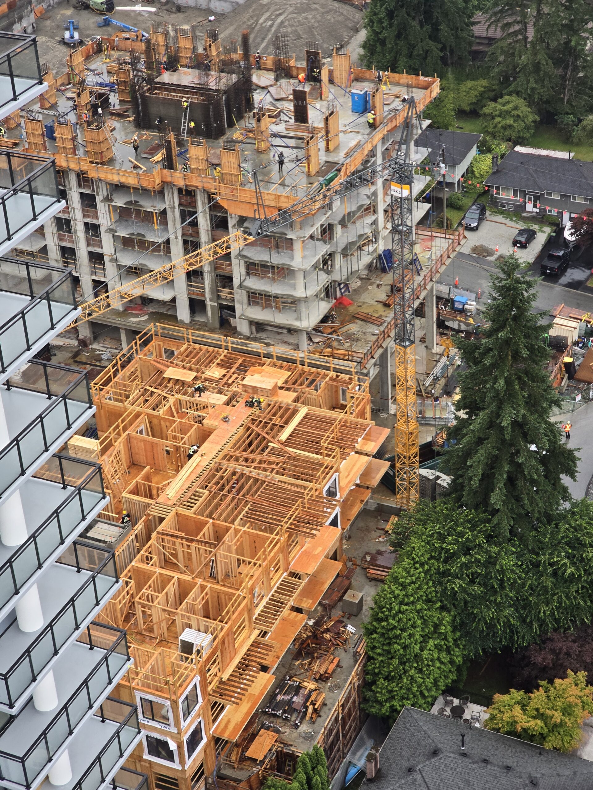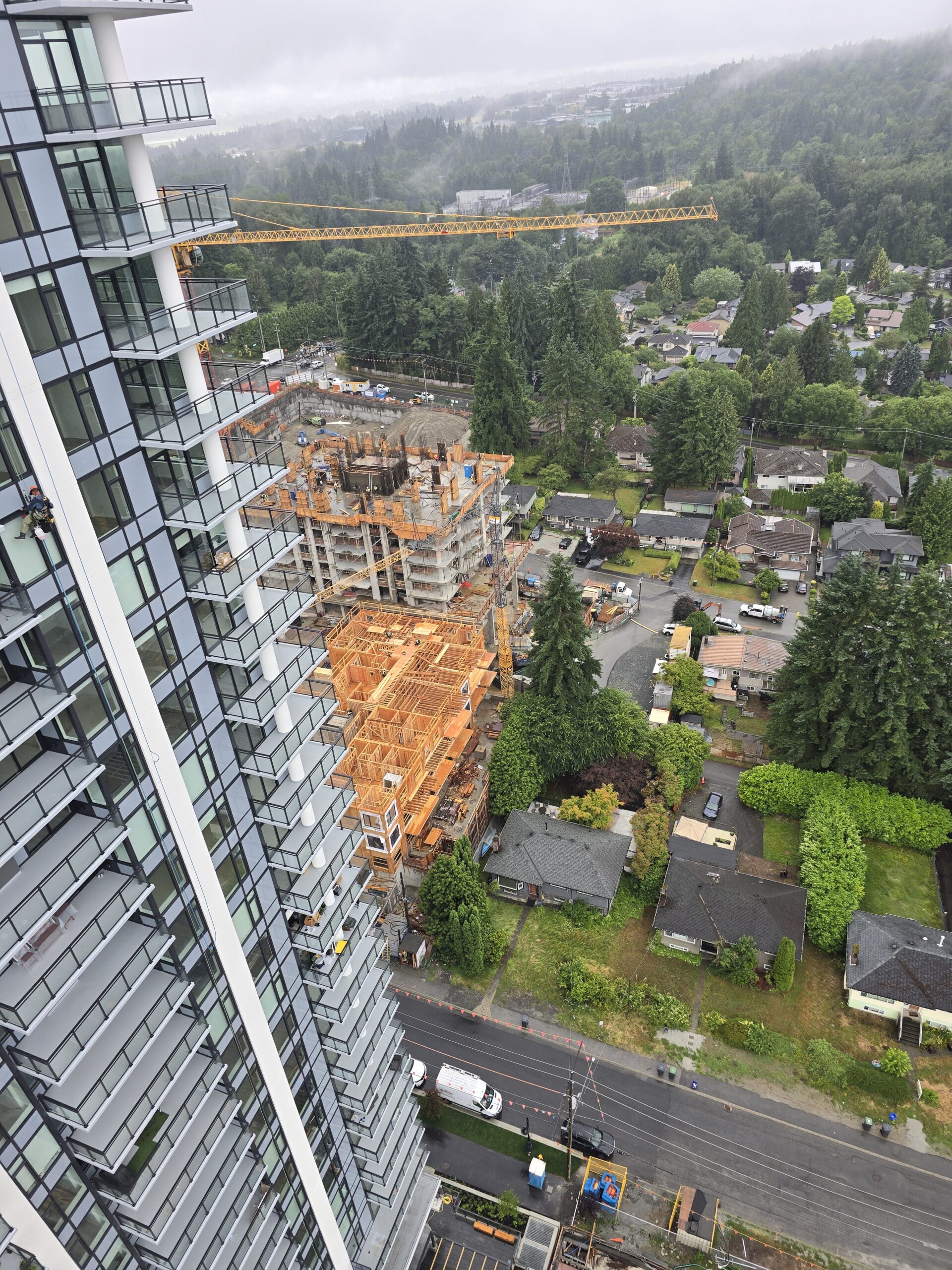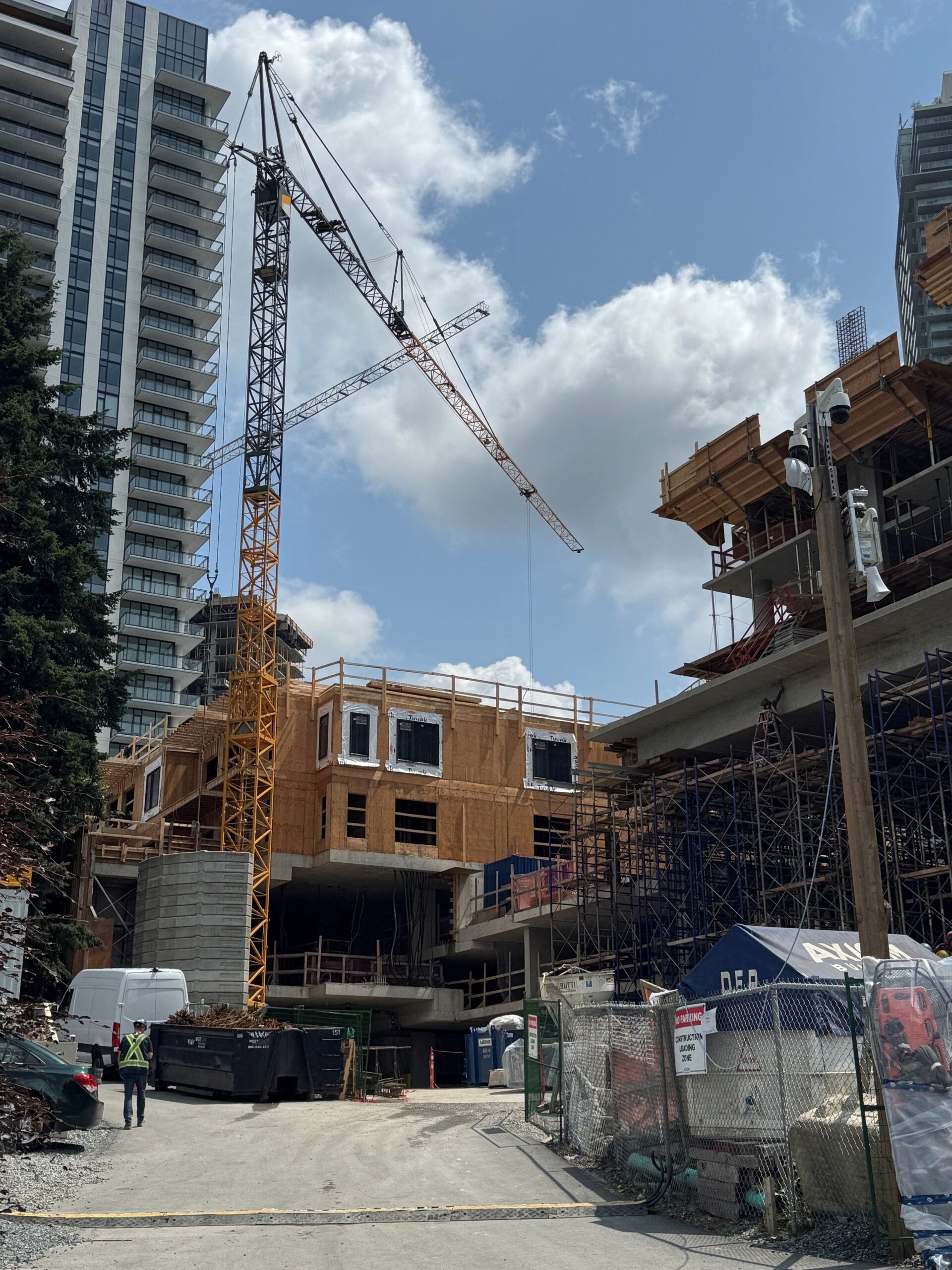 At the base of a 35-storey high rise in Coquitlam, BC, Bigfoot Crane Company deployed a Liebherr 81K.1 self-erecting tower crane in a challenging, space-constrained environment to erect Komo, a six-storey wood-frame building built by Legend Builders. The project demanded precision, flexibility and an innovative approach to crane setup, reach, and safety over four months.