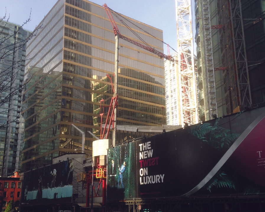The Situation: The Paradox Hotel in downtown Vancouver needed a way to hoist all the pieces of the steel canopy at its podium up as high as seventy feet above street level. The crane had to stay in place for several months and operate within a narrow space between two existing high-rises, all without blocking the street and the sidewalk or interfering with a second crane on the same site.